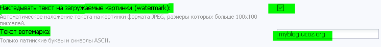 Заходим в "Общее" -> "Панель управления"![]() Далее "Редактор страниц" -> "Общие настройки" ![]() Ищем строчку "Накладывать текст на загружаемые картинки (watermark):" и ставим галочку напротив.Пишем ваш текст ![]() Готово,спасибо за внимание!Мы вотемарк не ставим чтобы не мешать лишними текстами вам когда вы смотрите на картинки!
